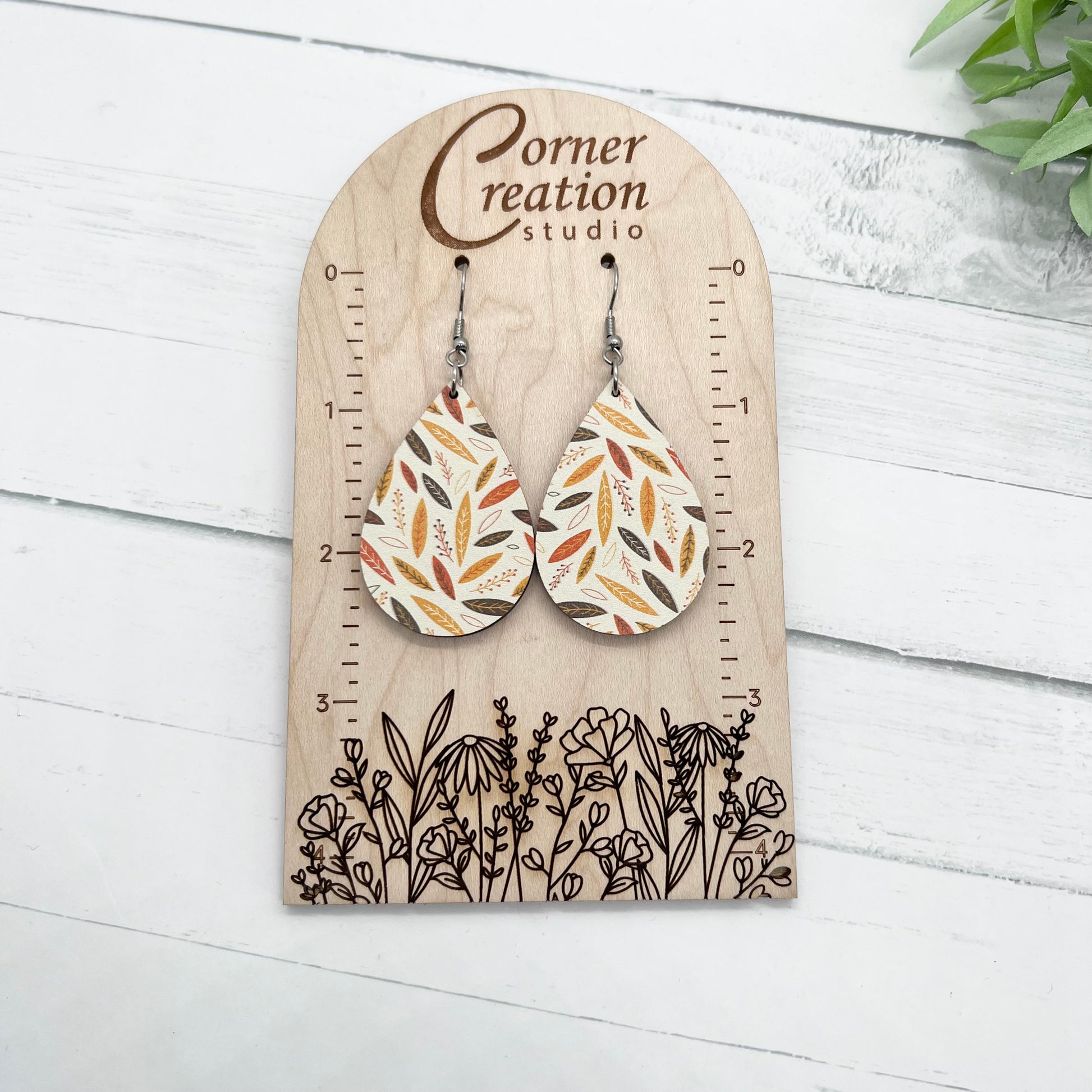 These are fall earrings made of a patterned wood which is double sided. This patterned wood is made possible by a UV printer so this is not paper and glue!
