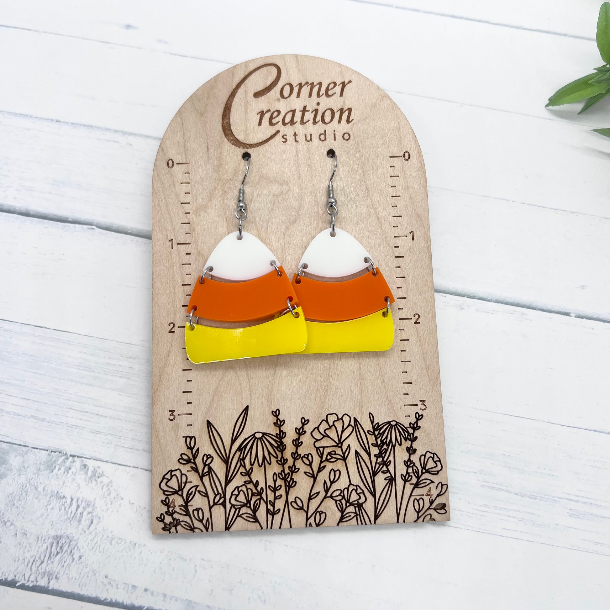 Show off your Halloween spirit with these fun Candy Corn Earrings! Made of lightweight acrylic and stainless steel hardware, these earrings are perfect for any spooky celebration.